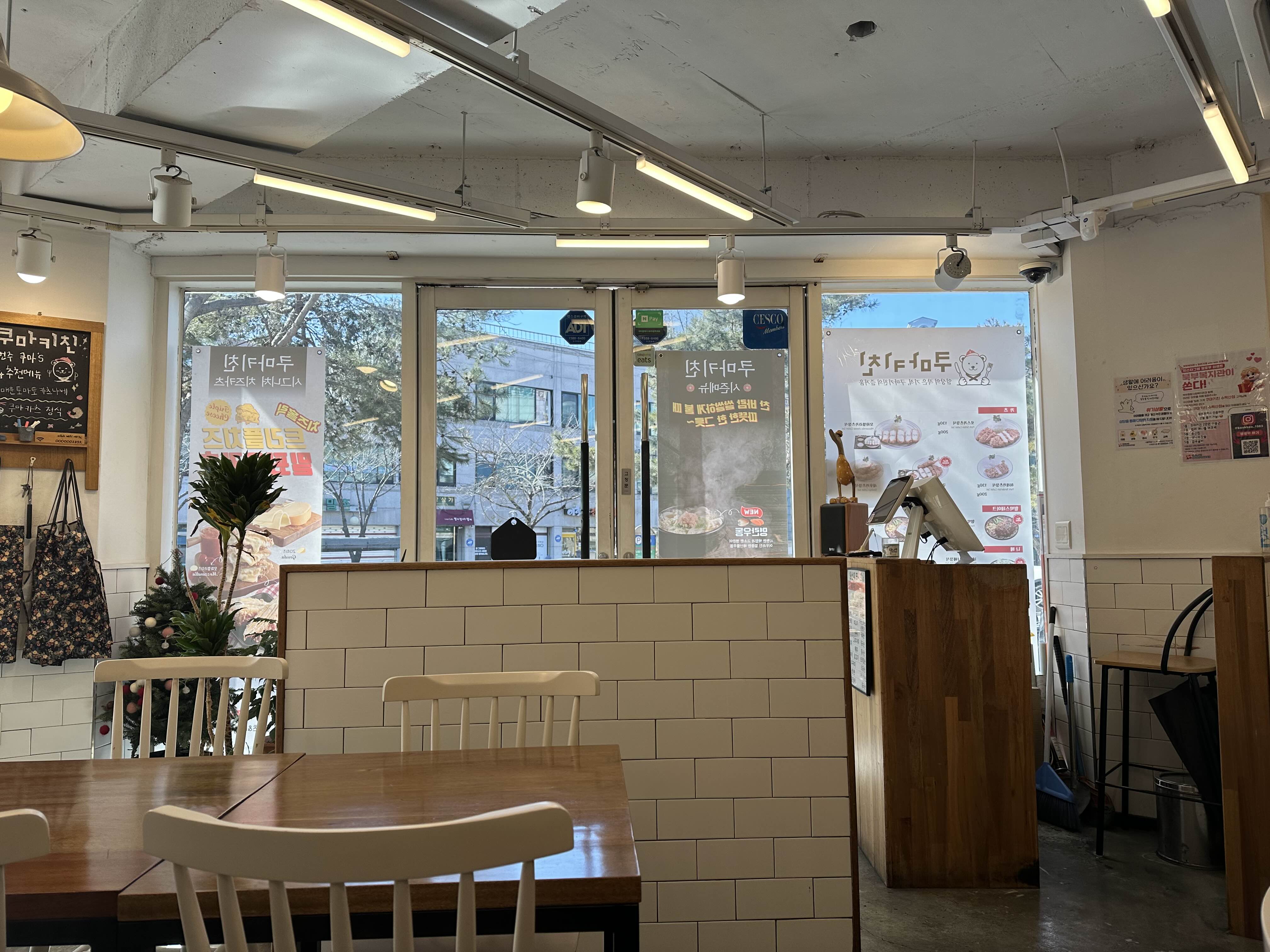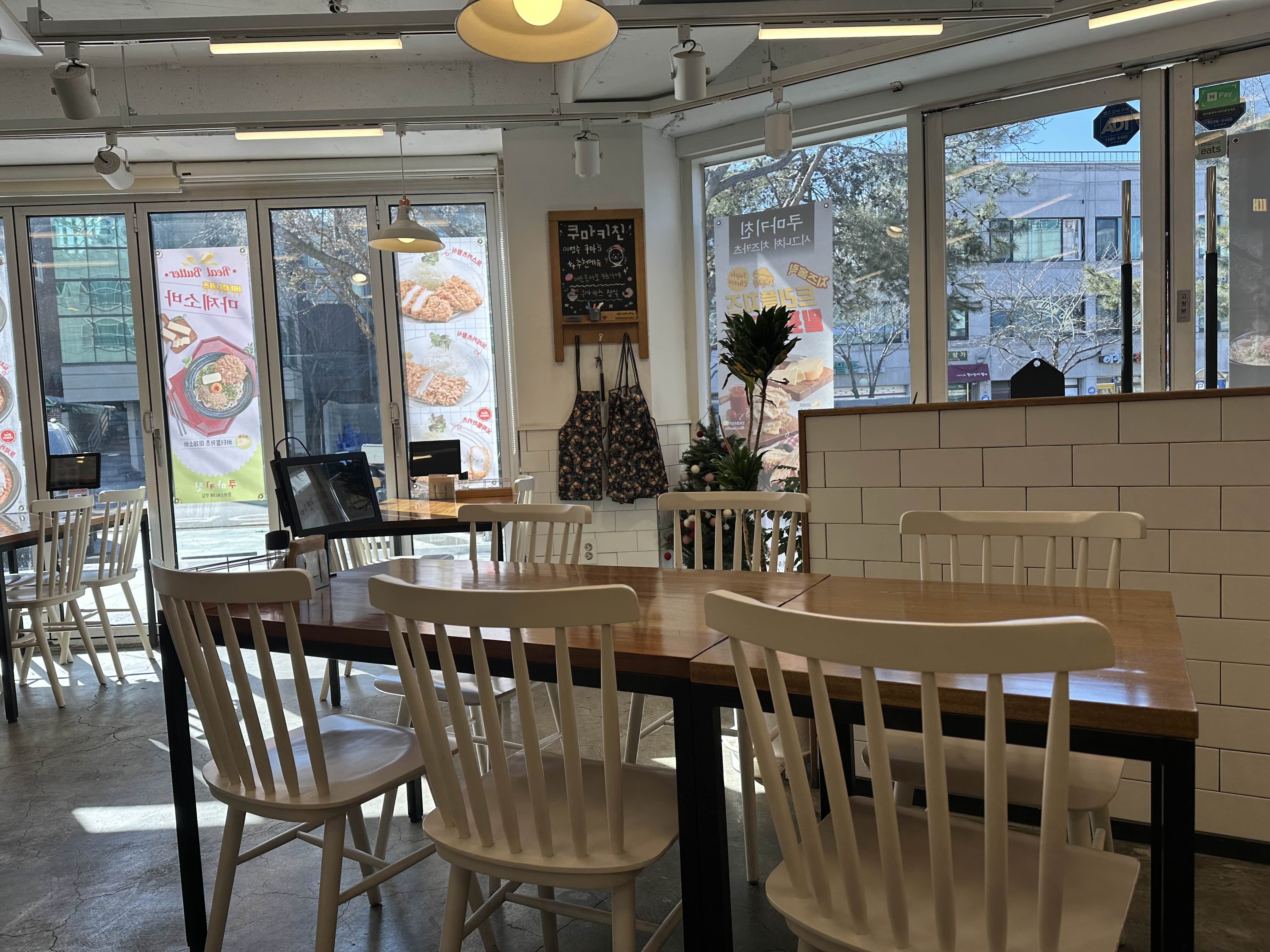 매장 안으로 들어가면 하얀색 배경으로 매장은 넓은 편이고 우드톤의 식탁이 잘 어울리는 공간입니다.