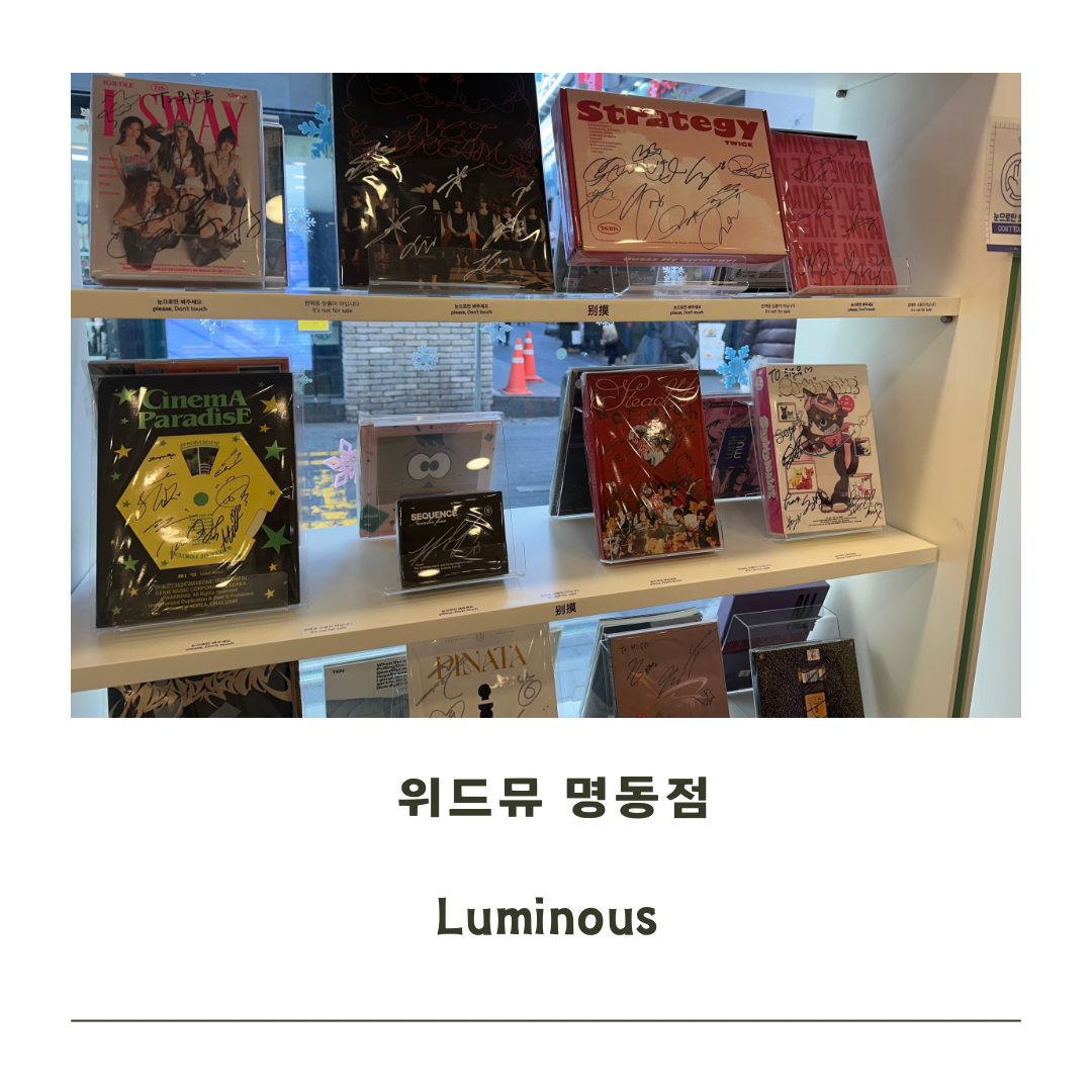 명동거리를  아이와 함께 걷다가 우연히 만난 위드뮤 명동점 처음엔 잠깐 들러보자는 생각이었지만,결국 저도 아이도 이날은 색다른 경험을 통해 많은 이야기를 나누며 즐거운 시간을 보낸 곳 같아요.명동 나들이 중 아이와 함께 즐거운 시간을 보내고 싶다면, K-POP에 관심이  있으시다면 위드뮤 명동점 한번 들려보시는 것도 좋을 것 같습니다.