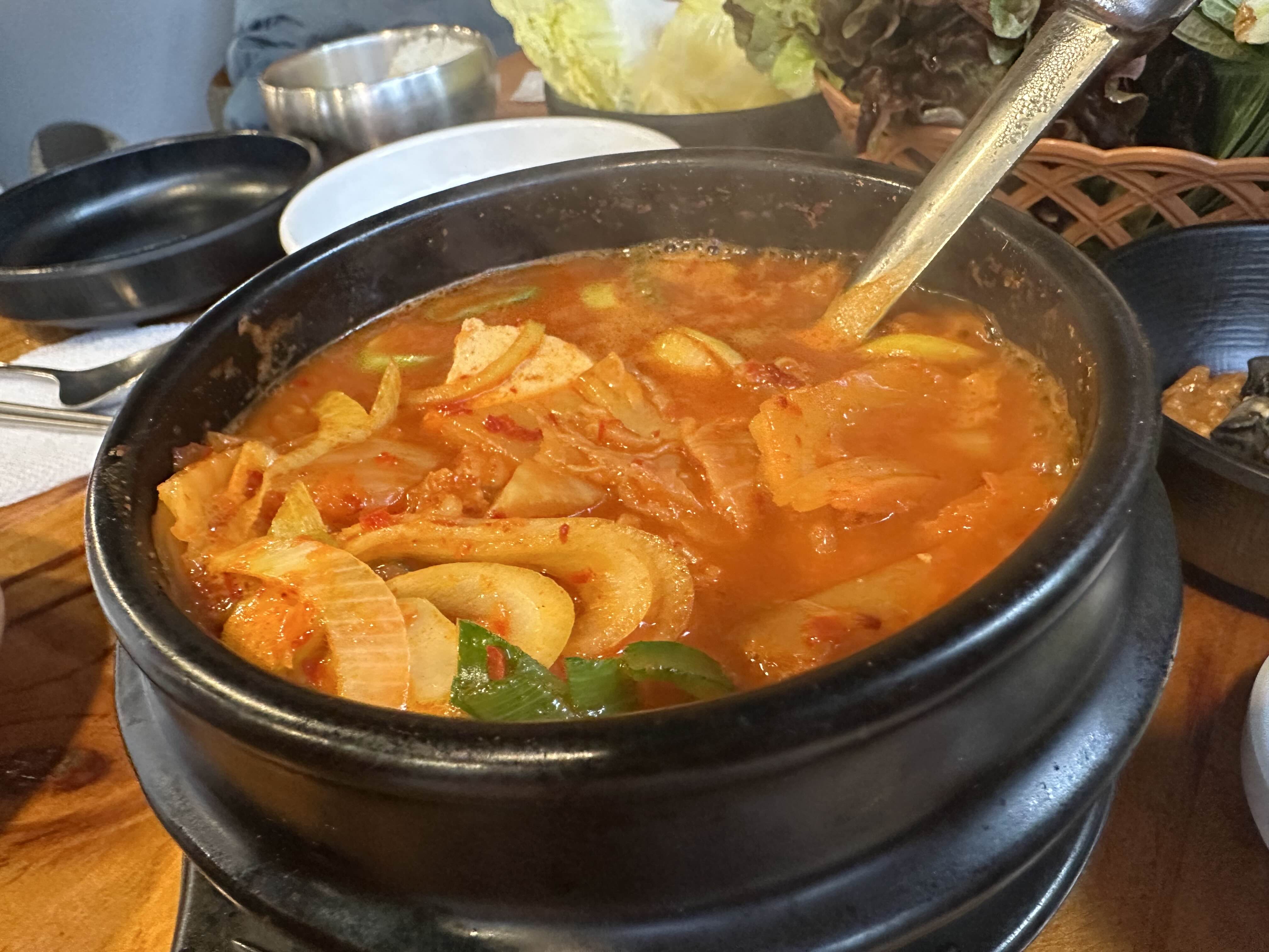 강경불고기 본점에서는 식사와 함께 얼큰한 김치찌개를 서비스로 제공해 더욱 만족스러운 식사가 가능합니다.