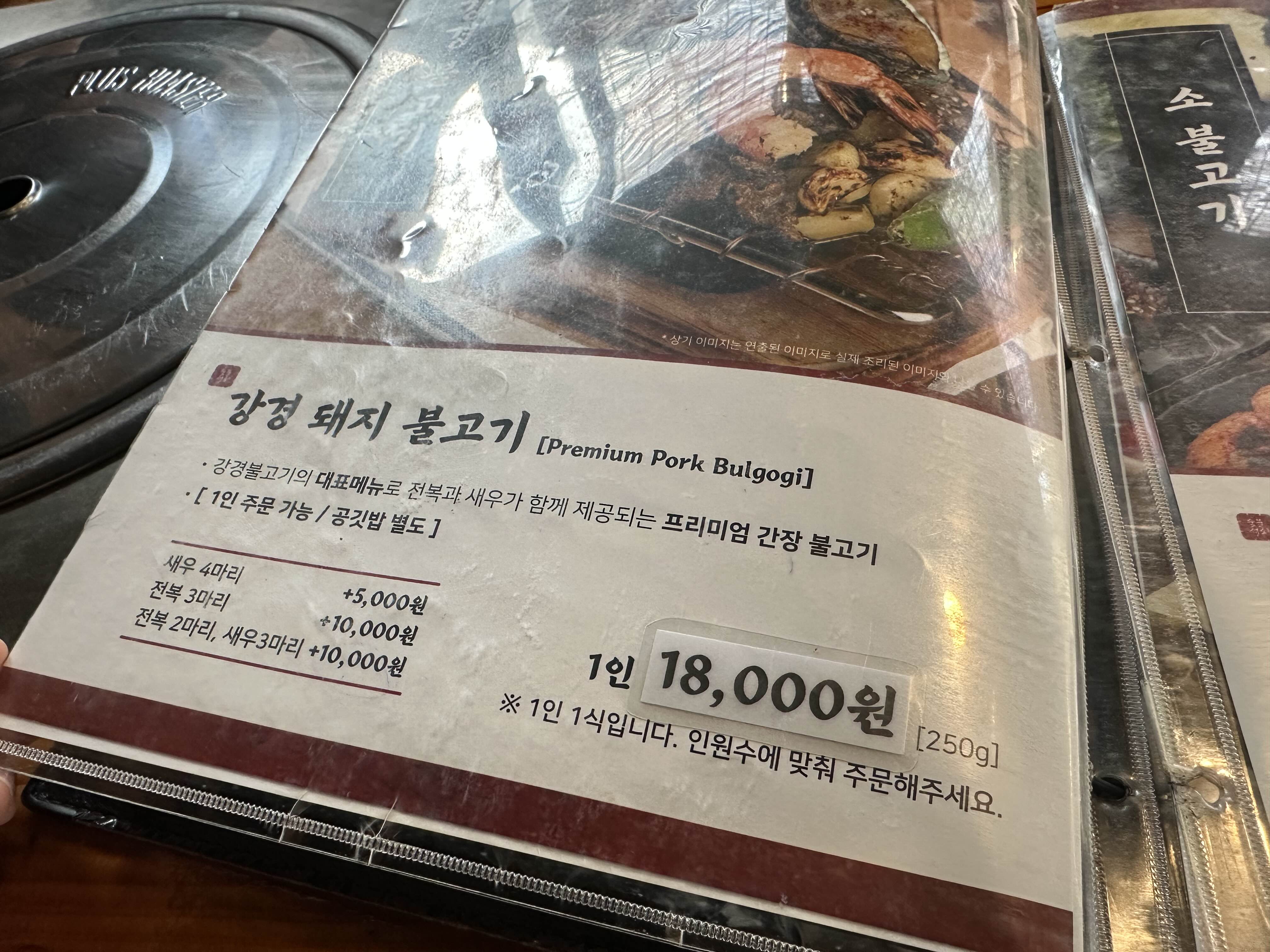 - 강경돼지불고기 18,000원 / 옛날소불고기 22,000원