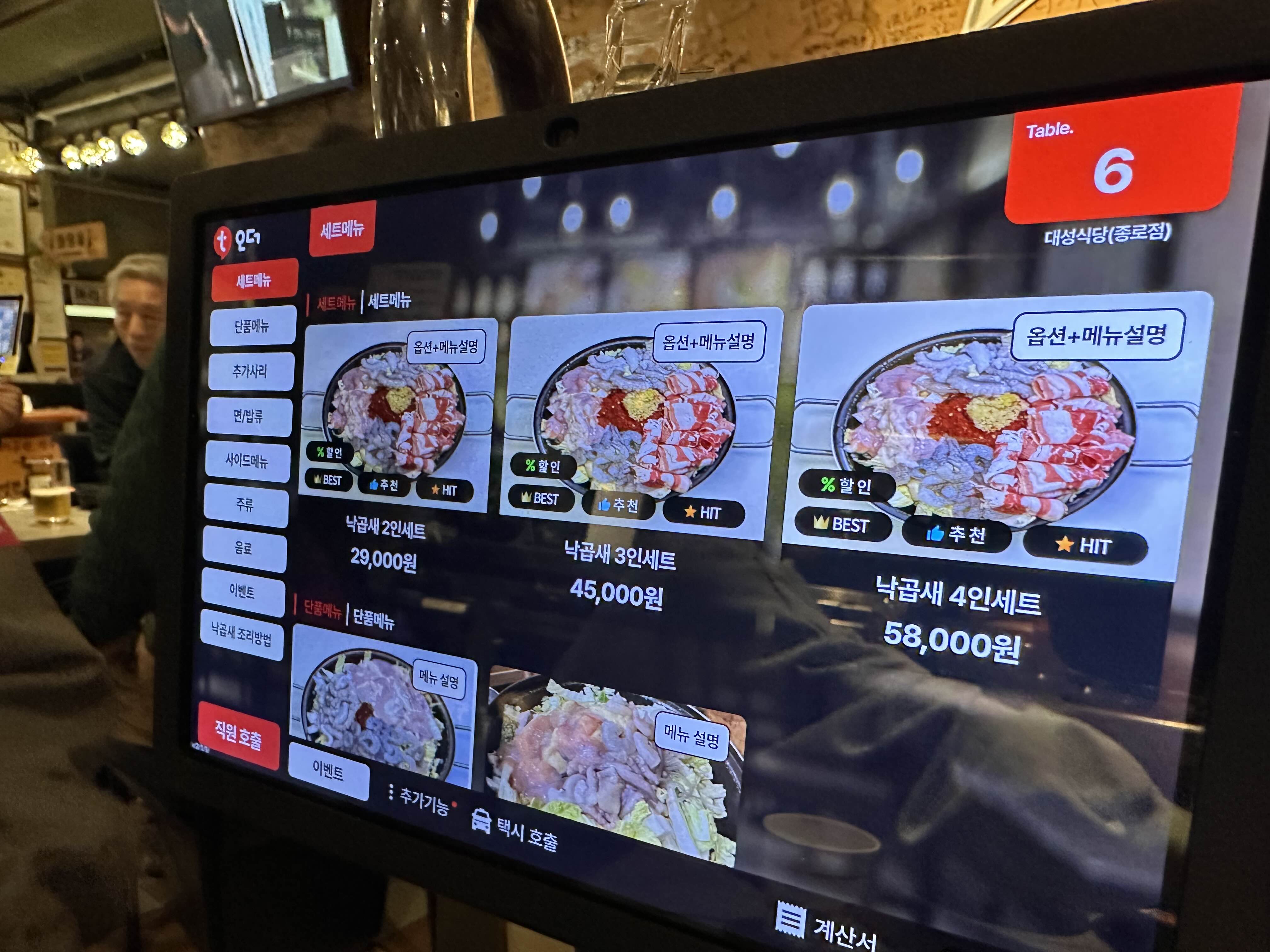 저희는 대성 식당의 대표 메뉴인 낙곱새 3인 세트를 키오스크를 통해 주문을 합니다. 요즘은 키오스크에서 간편하게 주문을 할 수 있어서 메뉴를 천천히, 고를 수 있는 점이 마음에 들어요.
