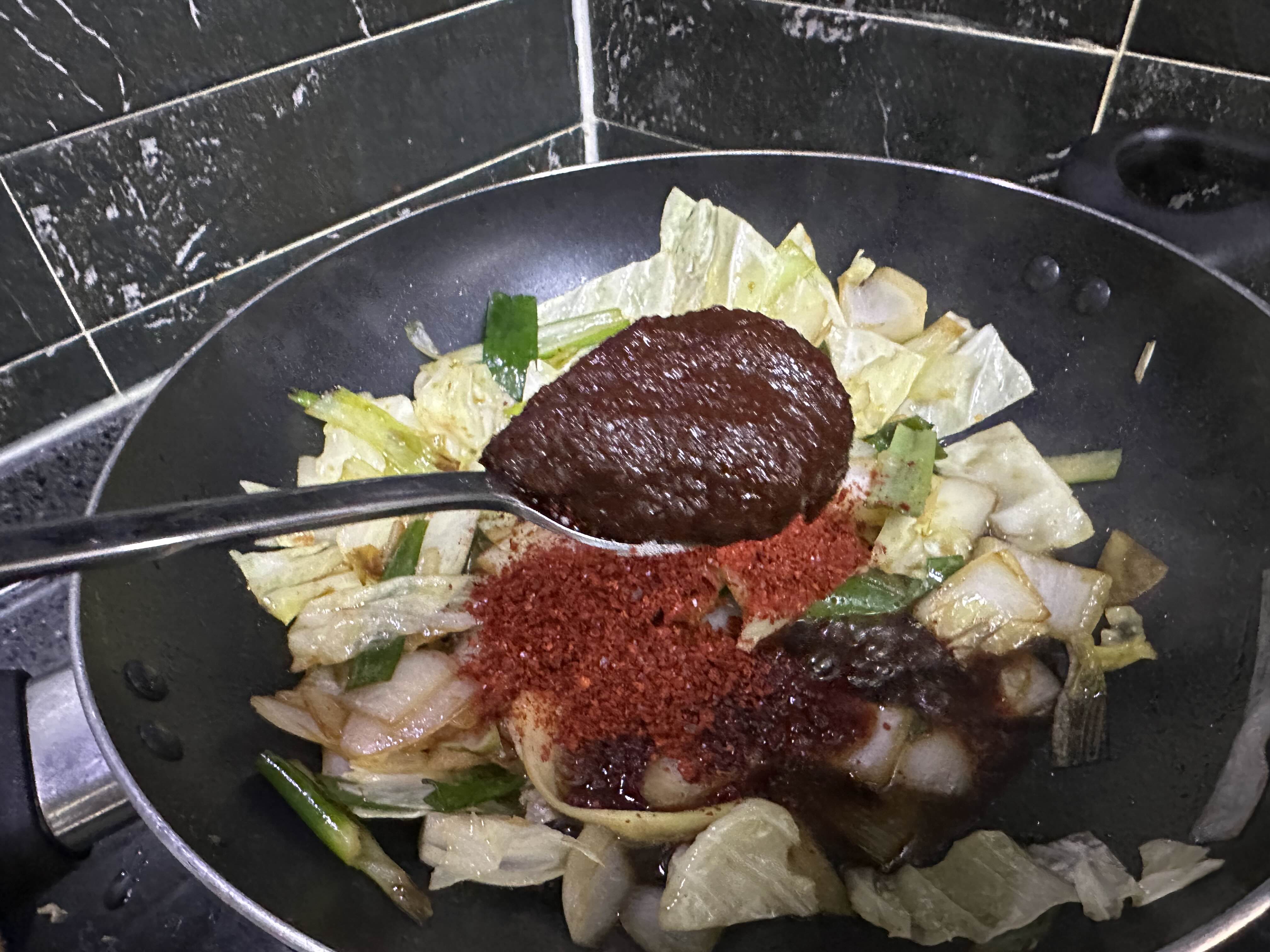 조금 끓여준 상황에서 양배추도 넣어 주고 함께 중불에서 볶아 줍니다. 어느 정도 양배추 숨이 죽으면 고추장, 고춧가루  넣고  한 번 더 볶아 줍니다.