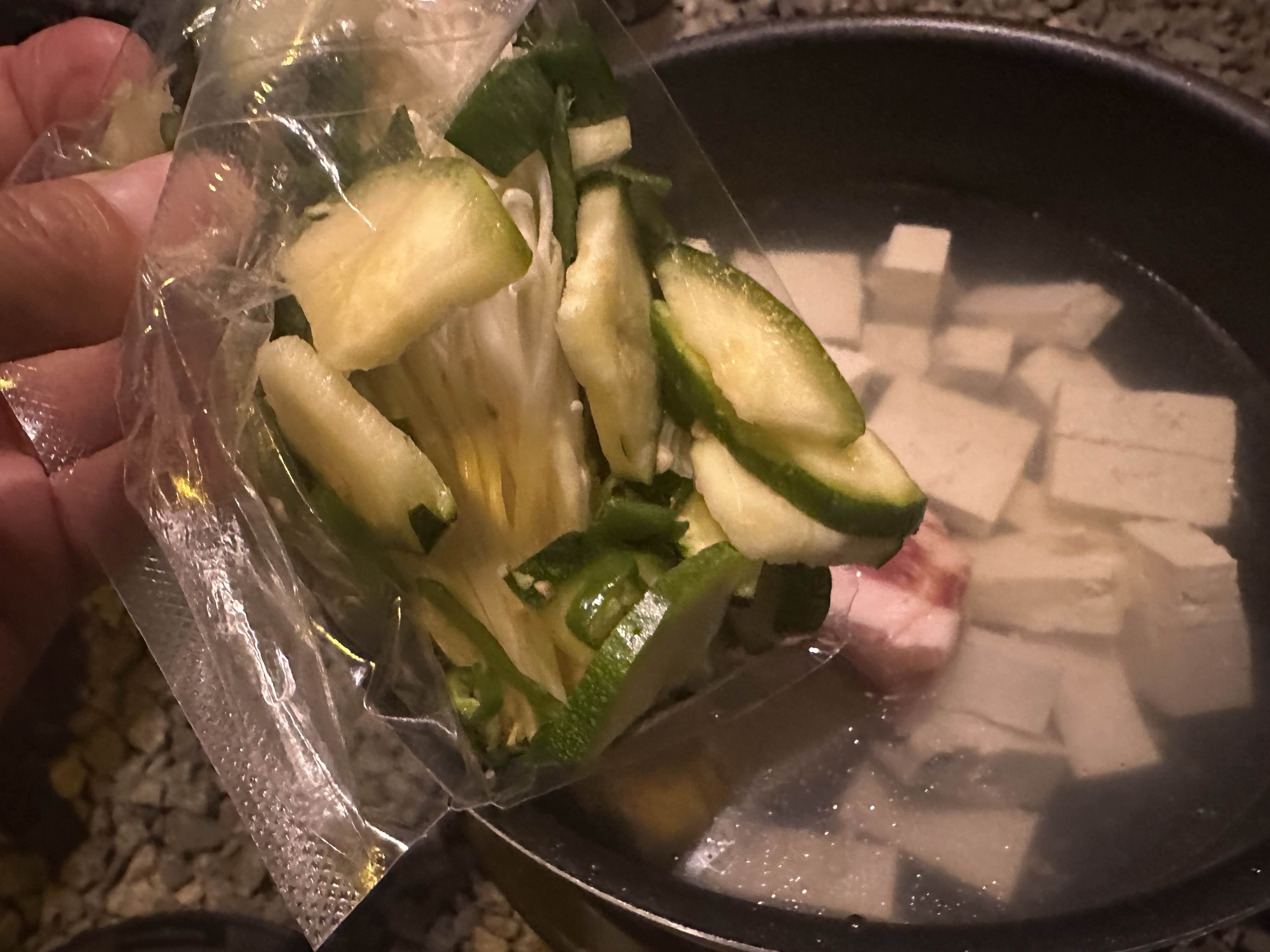 - 냄비에 호박,팽이버섯 등 재료를 넣고 강불로 끓여주세요